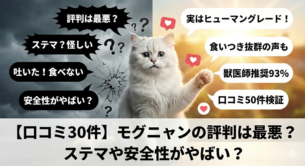 【口コミ30件】モグニャン(キャットフード)の評判は最悪?ステマや安全性がやばい?