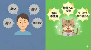 • 飼い主の負担: 毎日の食事のたびに「臭いな」と感じるのは、飼い主さんにとって小さなストレスの積み重ねになります。