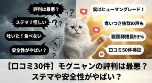 • 代替案: 運動量が少ない猫には、同じグレインフリーでも低脂肪・低カロリーな「モグニャン(白身魚メイン)」の方が、体重管理をしやすくおすすめです。
