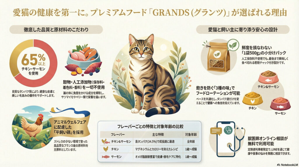 グランツ(GRANDS)という名前の由来については、公式サイト等で明確な意味は公表されていませんが、英語の「Grand(雄大な、素晴らしい)」などに由来し、愛猫への「最高・素晴らしい食事」という願いが込められていると推測されます。